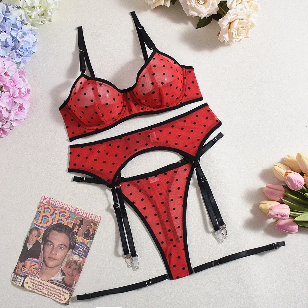 2024 New Arrival Women's Sexy Mesh Lingerie Set Hot Sales Dots Design Underwear Set 3pcs in 1